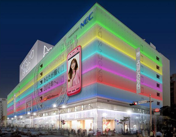 NEC runs huge illumination ad campaign for MEDIAS smartphone on exterior of Matsuya Ginza dept. store: http://bit.ly/ze3S2w